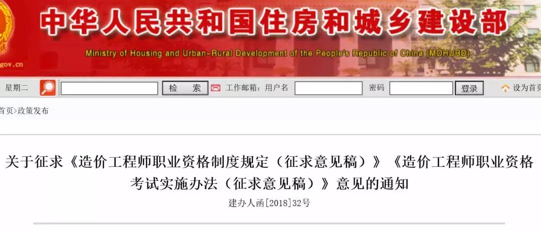 2018年1月23日住建部官方網(wǎng)站發(fā)布了題為“關(guān)于征求《造價(jià)工程師職業(yè)資格制度規(guī)定(征求意見稿)》《造價(jià)工程師職業(yè)資格考試實(shí)施辦法(征求意見稿)》意見的通知”。