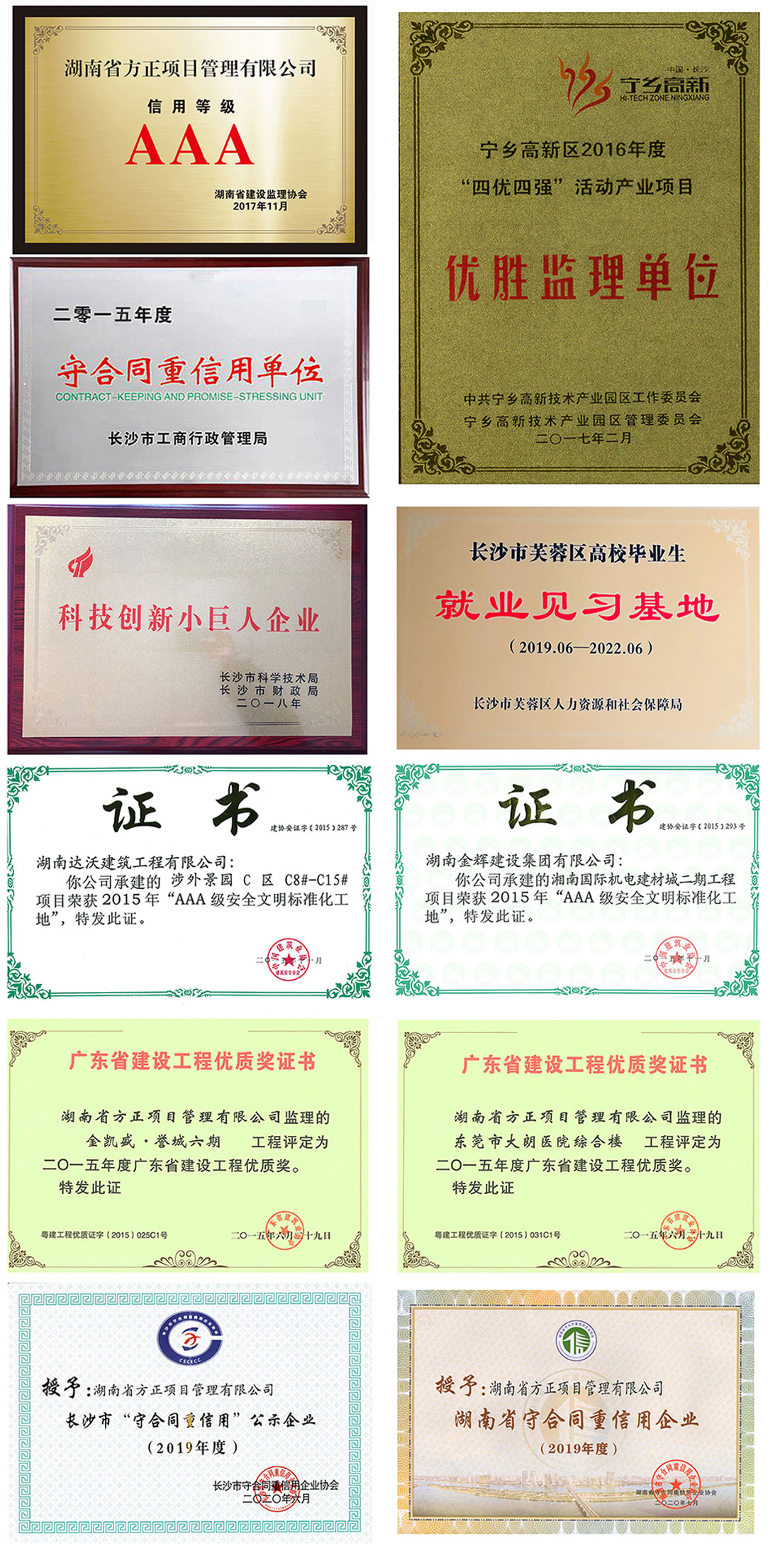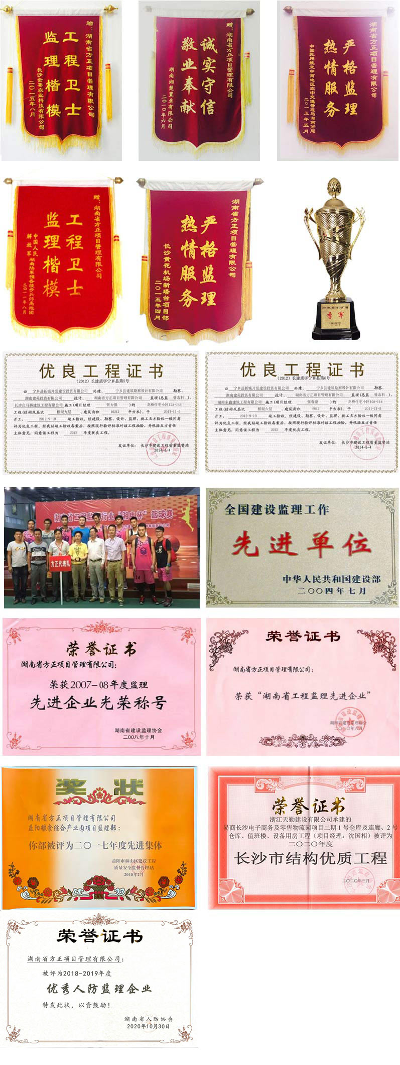 湖南方正二十多年來,成果豐碩,有口皆碑,連續(xù)多年被評定為湖南省監(jiān)理行業(yè)AAA誠信企業(yè),是湖南省、長沙市“守合同、重信用”單位,承接的建筑工程監(jiān)理、市政公用工程監(jiān)理、項目管理、技術(shù)咨詢,其單位工程合格率100%,業(yè)主滿意度100%,所管理的項目為業(yè)主直接挽回經(jīng)濟(jì)損失上億元。多項工程被政府評為“魯班獎”、“芙蓉獎”、“國家優(yōu)質(zhì)工程獎”、“裝飾金獎”、“市政金杯示范工程”、“全國AAA文明示范工地”等獎項。企業(yè)文化豐富多彩,在參加2015年度湖南省工程監(jiān)理行業(yè)“湘電杯”籃球賽中,異軍突出喜獲季軍;湖南省工程監(jiān)理行業(yè)(監(jiān)理之光)首屆攝影比賽第二名,是湖南省監(jiān)理行業(yè)誠信品牌企業(yè)(下圖為公司部分獲獎?wù)故?。